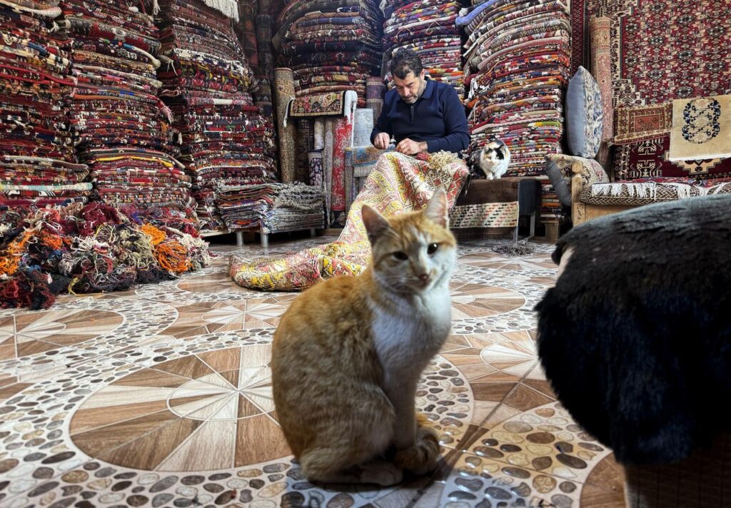 دو گربه به نام‌های کهربار و ساری آزادانه در کارگاه پرسه می‌زنند و اغلب هنگام کار کنار آکباش جمع می‌شوند. گربه‌های بی‌سرپرستی که او نجات داده، هر صبح پشت در منتظرش می‌مانند و خرخر آرامشان با صدای آرام سوزن و نخ همراه می‌شود. حضورشان دلگرم‌کننده است؛ یادآوری کوچکی اما همیشگی از اینکه این فضا تنها با فرش‌ها زنده نیست، بلکه با همدمی و گرما نیز جان دارد.