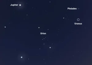 اورانوس: مانند مشتری در ارتفاع بالایی قرار دارد و در صورت فلکی ثور، پایینتر از خوشه پروین جا خوش کرده است. با یک دوربین دوچشمی میتوانید آن را شکار کنید.